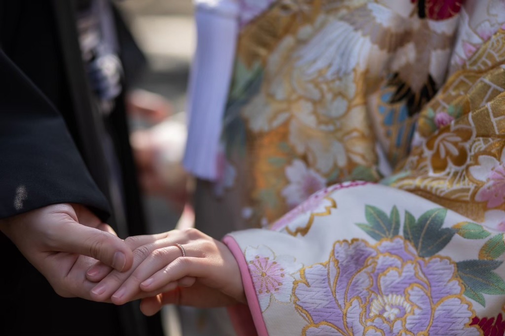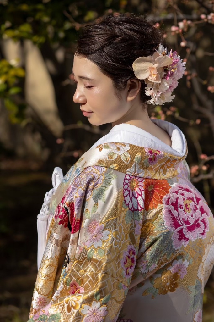3月に都内和式庭園で前撮りをされた花嫁様。楽しみにしていたお写真を拝見しました。暖かい日だったにもかかわらず化粧崩れもなく、ツヤツヤのまま撮影できたとのこと。指先まで完璧です。輝くお肌と豪華な色打掛がベストマッチ!