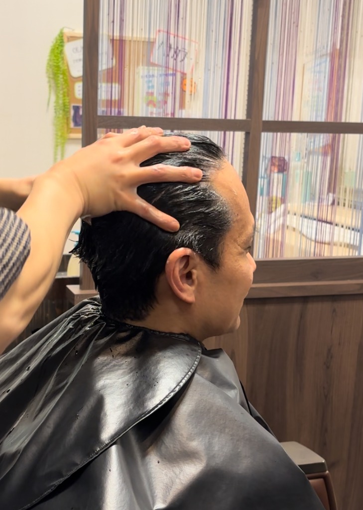 トリートメントクリームで頭のツボをしっかりマッサージしていきます。